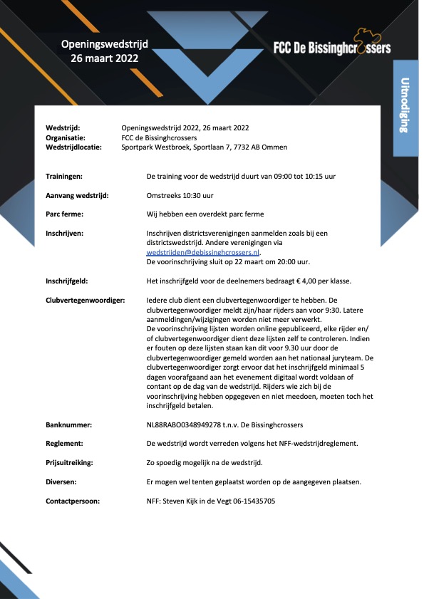 Op zaterdag 26 maart organiseren wij als de Bissinghcrossers de Openingswedstrijd NFF. Zie uitnodiging voor de nodige informatie.